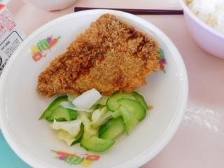 今日の献立は、鹿児島県本土や、こしき島、種子島周辺で一年中とれる魚、きびなごに衣をつけて揚げた「きびなごフライ」と、名物「さつま揚げ」が入ったごま和え、特産物のサツマイモが入った「さつま汁」、そしてデザートはサツマイモの中でもダントツの甘みを持った種子島特産の安寧芋を使った「安寧芋プリン」でした。