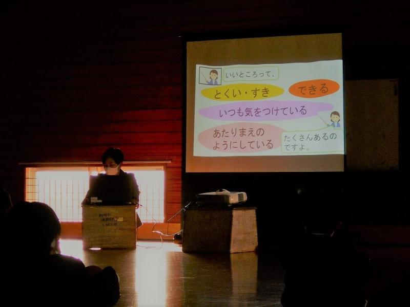 初めに、事務局長さんの作成した中橋久左衛門の紙芝居を読んでいただきました。とても鮮やかできれいな絵で、水がなく困っていたこと、中橋久左衛門が神社にお参りしておつげを受けて村の人の手で用水を作ったことなど、中橋久左衛門の作った河原市用水のことが分かりやすく理解できました。