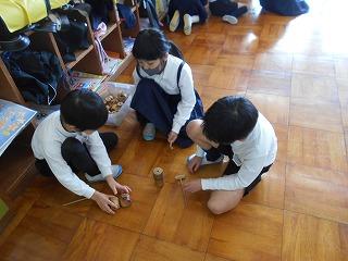 けん玉、お手玉、おはじき、だるまおとし、こままわしを、少人数のグループに分かれて遊びました。