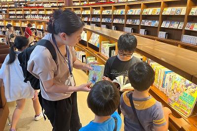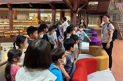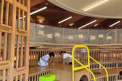 室内遊具で、体を動かした後に、館内を見回り、どのような本があるかを調べました。