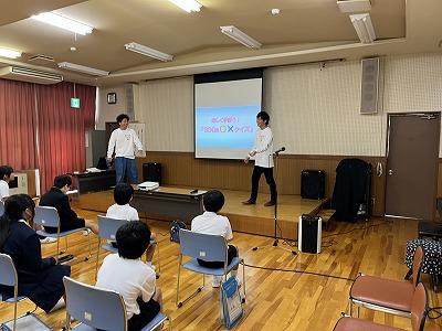 3・4年教室でクイズを出す1年生。