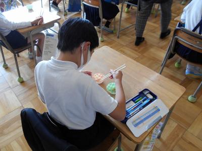 初めに、正しいお箸の持ち方や食事中にしてはいけないお箸の使い方(まよいばし、さしばし、わたしばし等)のお話を聞きました。