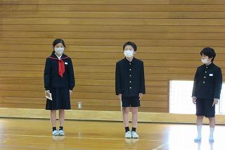 最初に、作品応募や郡市の作品展、校内マラソン大会等の表彰を行いました。代表の児童が、立派な姿で賞状を受け取りました。優秀な成績を収めた児童のみなさん、おめでとうございます。