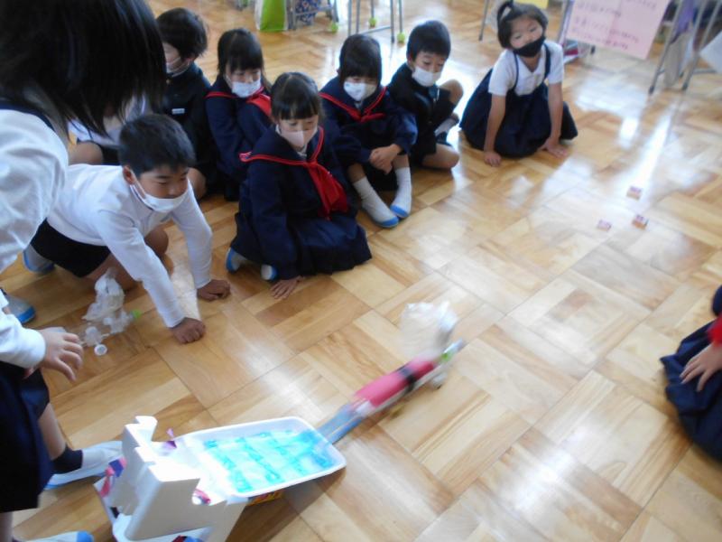 お店はゴムで走る車、風で走るカーレース、ドキドキびっくり箱、空気のひこうき、風で走ってごみを集める車、まとあてロケット、坂道電車の7つです。