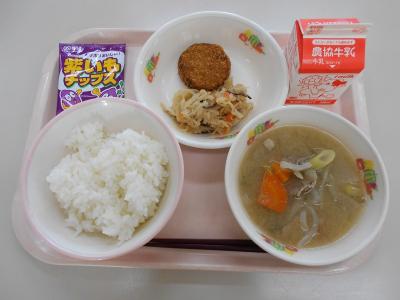 ごはん、☆イカメンチカツ、☆切干大根煮、豚汁、☆紫芋チップスです。
