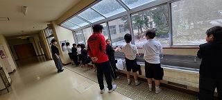昨日から降り積もった雪が水分を含んでいる中、6年生を中心に登校してきた児童が雪かきをしてくれました。