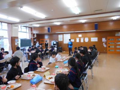 先週の24日の給食時間、栄養教諭から給食のはじまりについてや、学校給食週間中の特別献立の説明がありました。