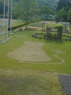 校舎と運動場の間に、謎の円形の模様があります。1階や近くで見てもなかなかわかりませんが、2階から見るとよくわかります。
