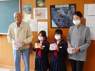 津幡町在住の川幡登様、節子様が、1年生のみなさんに鉛筆立てをプレゼントをするために、来校されました。
