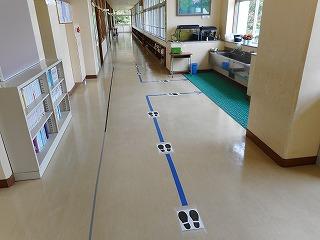 3か所ある手洗い場に「足型」をつけました。ソーシャルディスタンスをとるためです。足型がないところでも、順番に並ぶときは、常にソーシャルディスタンスを意識できればと思います。