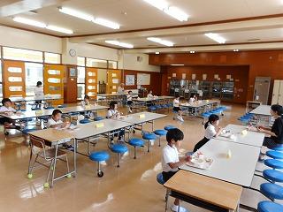 今日から1年生の給食が始まりました。1年生は、ランチルームで食べました。3密にならないように間隔を空けて、静かに食べました。おいしそうに食べていました。