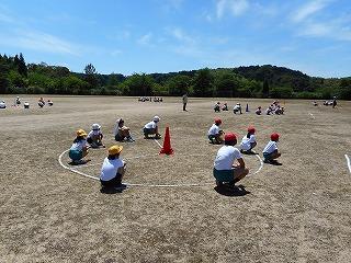 1年生は、はじめに交通安全についてのお話を聞いた後、運動場にでて、道路に見立てたコースを安全に歩く練習をしました。