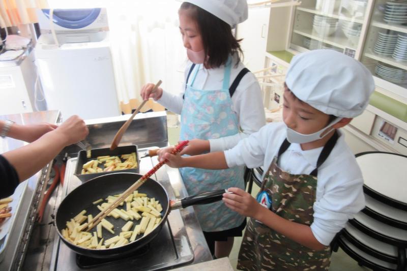 1・2年生とかがやきさんは、合同でさつまいもの調理をしました。