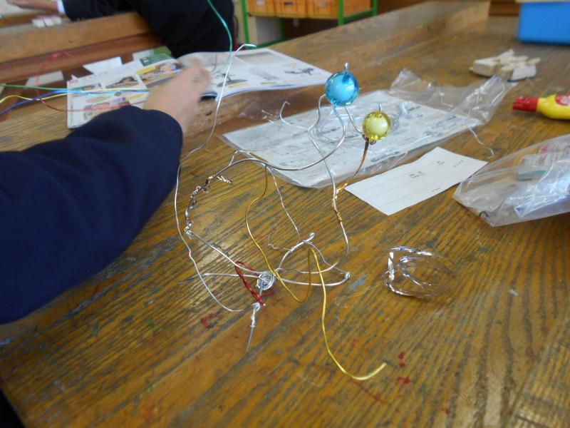 石川県野鳥の会の方と一緒に学校の周りで冬鳥を見つけてバードウォッチングしました。声が聞こえるけど姿が見えない!でも、じっと目を凝らして8種類の鳥を見つけました。ハシボソガラスが屋根や木の枝にとまっていました。鳥の大好きな実も見つけました。萩野っ子のみんなはバードウォッチングすることで自然が一層身近に感じたことでしょう。4年、5年の図工では、鋸で切った木材を組み合わせたり、針金を組み合わせたりして、想像の世界にはばたいて作品を作りました。どんな作品になるのでしょうね。
