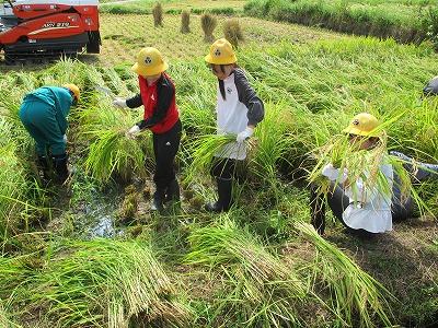 今日も、前日までにいろいろと準備をしてくださり、すぐに刈り取り作業ができるようになった田んぼで、いざスタートです。
