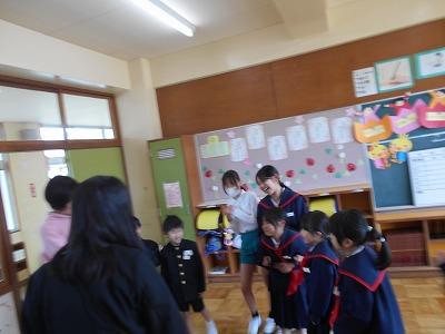 代表の児童から花束と最後には卒業生を含め、全校生徒で校歌を歌い、