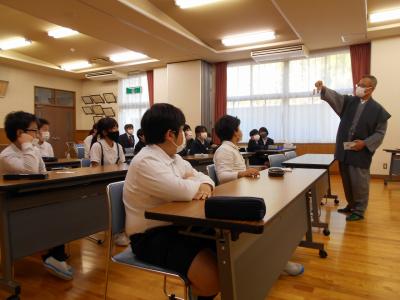 講師である落語家の月亭方気さんから、落語の歴史についてや、落語にオチがあること、落語を聞くことで教養が身に付いたり想像力や表現力が身に付くことなどを聞いてから、実際の落語の小噺を2つ聞かせていただきました。