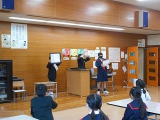 5年生から今月のめあてのふりかえりと、4年生からショートコントを交えた今月のめあて「相手の気持ちを考えた言葉遣いをしよう」についてのお話がありました。