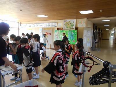 3~6年生は来週の音楽会に向けて、太鼓演奏の時に羽織るはっぴを決めました。