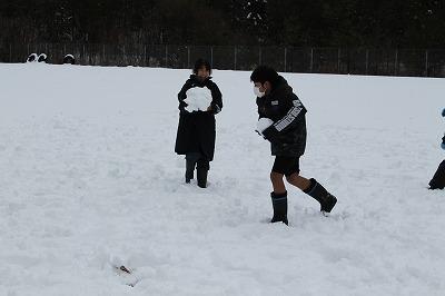 担当の5・6年生から遊びの内容や、安全についての話をした後、グラウンドで雪合戦と自由遊びをしました。