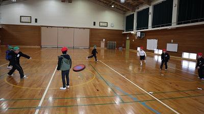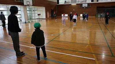 反対側のコートでは、フラフープの用具を出し、友達と回して競い合う児童、