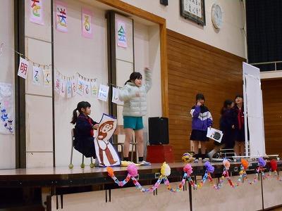 続いて、刈安小学校の出し物は「冬と言えば~?」の連想クイズや、「回文作り」などの言葉遊びゲームでした。