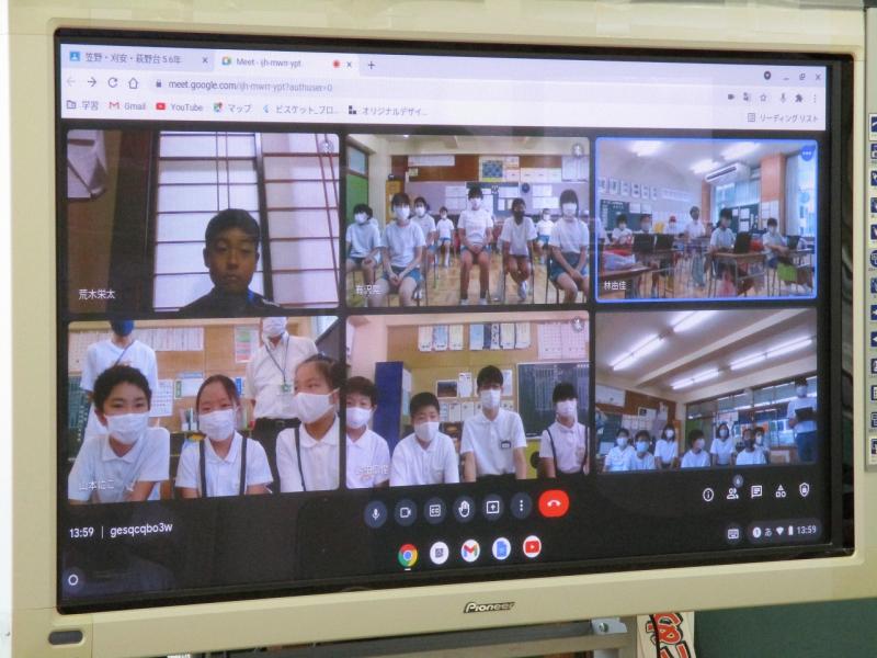 今日の午後、笠野小学校、刈安小学校、そして萩野台小学校の3校合同で、オンラインによる交流を行いました。10月4日、5日に合同で行う野外活動のめあてなどを発表するためです。