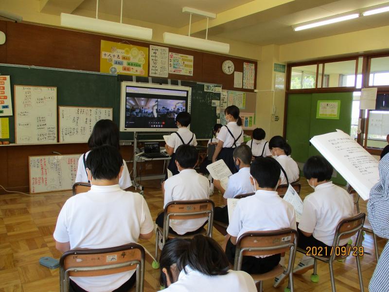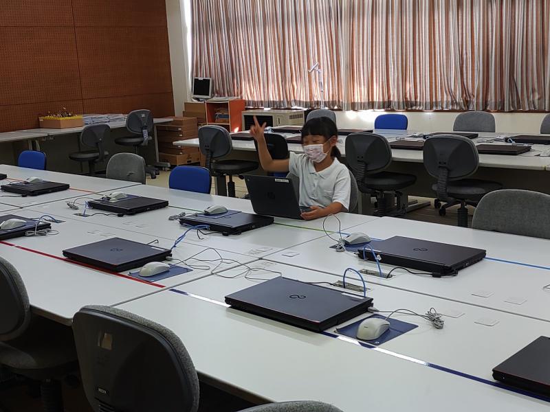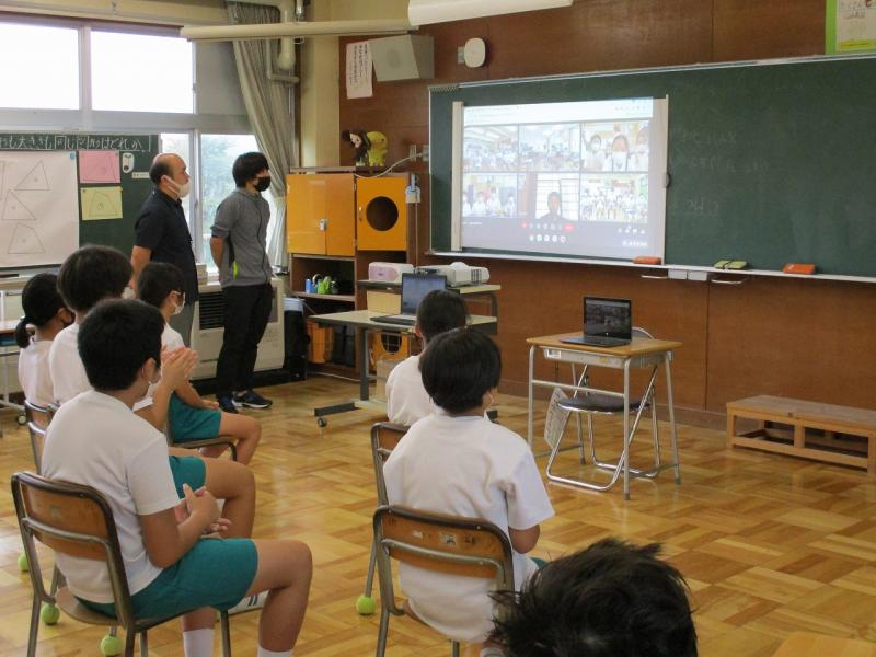 5時間目、1年生はタブレットを使い、オンラインで授業をしました。1年教室、図工室、パソコン室から職員室にいる先生と4人がバラバラの場所から会話をしたり、じゃんけんをしたり、楽しんで勉強していましたよ!