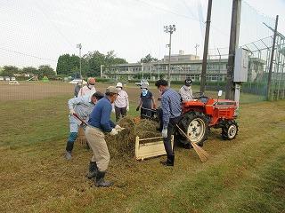 早朝6時前から、別所シニアクラブの皆様が、これまでに草刈り機や芝刈り機等で刈った草を集め、集めた草を草捨て場まで運んでくださいました。運動場がさらにきれいになり、どこの学校にも負けない立派な運動場になりました。