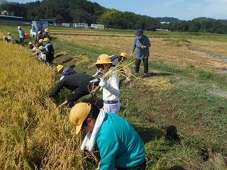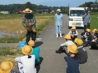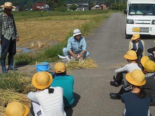 高学年はめあて「みんなで楽しく安全にいねかりをしよう」のもと、いねかりの活動を行いました。日頃、お世話になっている小山さんや大西さんのお話をお聞きした後、いねを刈っていきました。