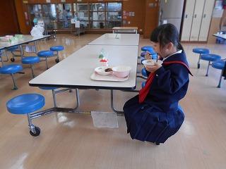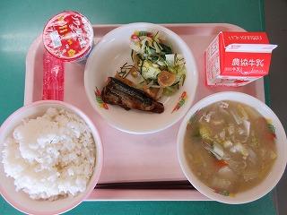 今日の給食は「ごはん、さんまのおかか煮、水菜のはりはり和え、打ち豆汁、デザート(ヨーグルト)」でかみかみこんだてでした。打ち豆汁の中の豆をよく噛んで食べました。また、水菜のはりはり和えの中のたくあんもよく噛みました。かみかみこんだては、月に数回あります。