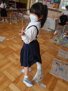 たこ焼き屋さん、お家、魔女のほうき、洋服、腕輪・指輪、剣、アイス、傘、靴、携帯電話など、新聞紙から、発想豊かにいろいろなものを作って楽しんでいました。