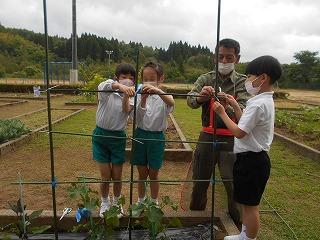 6限目には、野菜のお世話をしました。きゅうりのたなをつくりました。今、10センチくらいのきゅうりができています。収穫が楽しみです。