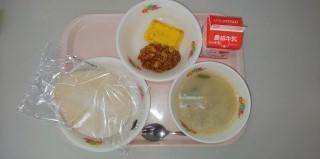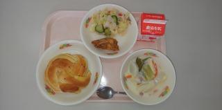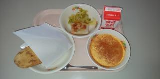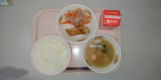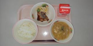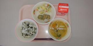 給食は和風でした。わかめごはん、牛乳、ちくわの磯辺揚げ、白菜のゆず風味サラダにかぼちゃのみそ汁です。低学年の児童には、ゆず風味のサラダが少し苦手のようでした…。