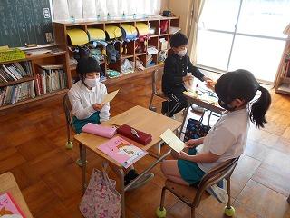 朝学習の時間に、2,3年生の教室で、司書さんに読み聞かせをしていただきました。2年生も3年生もお話を聞くうち、どんどんお話の中に引き込まれ、思わず、「ええーっ!」とか「いいなあ」などと、つぶやいていました。「あまのじゃくなかえる」は、お母さんに言われたことを聞かず逆のことばかりしていたかえるが、お母さんがなくなってからとても後悔するお話。自分にもあまのじゃくなところがあるなと、ついつい反省させられてしまいました。