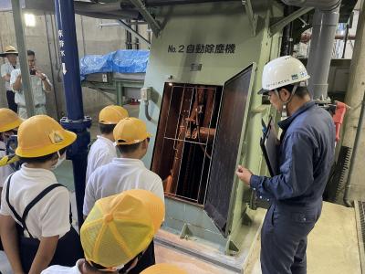 子どもたちは、始めてきた施設に緊張しながらも、下水道の仕組みを職員の方から説明をうけ、一生懸命にメモをとっていました。