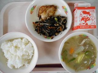 今日の給食は「ごはん、鶏肉のてりやき、ひじきと大豆の炒め煮、めった汁」です。