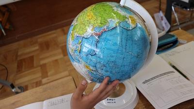 社会の授業で地球儀を一生けん命回して見ていました。大陸や三大洋などを調べていました。