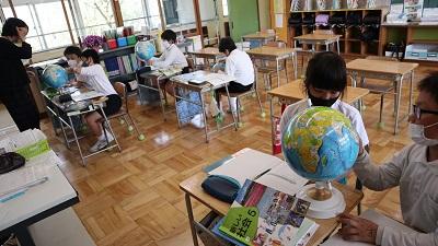 社会の授業で地球儀を一生けん命回して見ていました。大陸や三大洋などを調べていました。