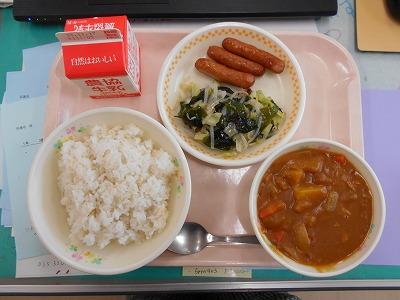 むぎごはん、バターチキンカレー、海藻サラダ、あらびきウインナー、牛乳でした。