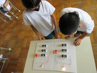 子どもたちは、さまざまな実験を試行錯誤する中で、乾電池3つだったらどうなるのか実験したい!という思いになりました。乾電池3つの場合、電流が強くなり、危険度が増すため、教員の指導の下、安全を確かめ、マンガン電池を使って実験をしました。実際に実験をすることで、直列つなぎは電池の数が増えると電流が大きくなり、並列つなぎは電池の数を増やしても電流の大きさは変わらないことをより深く理解することができました。