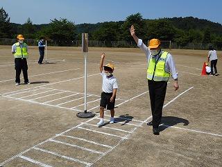 1年生は、はじめに交通安全についてのお話を聞いた後、運動場にでて、道路に見立てたコースを安全に歩く練習をしました。