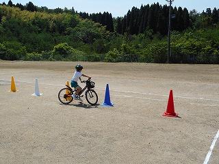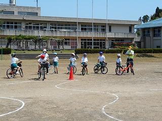 4年生は、教室で交通安全に関するビデオをみたあと、運動場のコースを自転車で通行してみました。