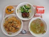 チキンライスにかぼちゃの形のハンバーグ、花野菜のサラダ、白菜と大根のスープとかぼちゃプリンのデザートでした。みんなとてもうれしそうに食べていましたよ♪
