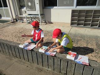 今日は、時間がたつと太陽の位置が変わるのかについて、かげの動きを調べながら観察しました。