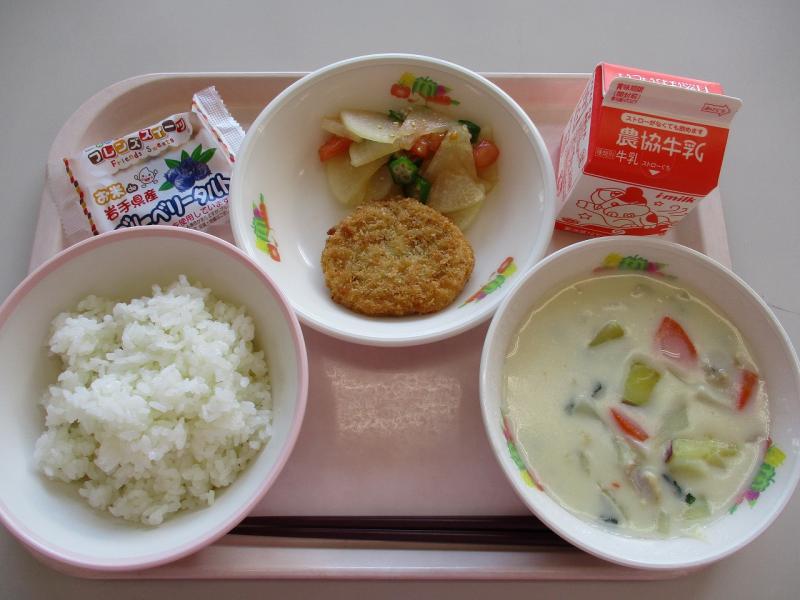 今日は津幡町の南中学校の生徒が考え、中学生献立コンクールで入賞した作品を少しアレンジしたものになっています。ごはん、牛乳、れんこんのはさみ揚げ、大根とオクラのとろーり和え、地元の食材たっぷり!クリームシチュー、ブルーベリータルトでした。