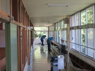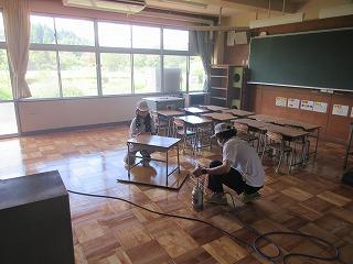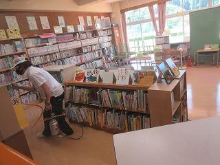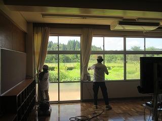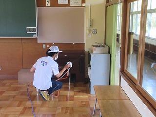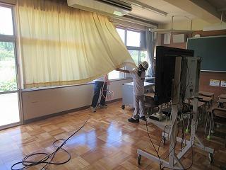 教室・ランチルーム・図書室・トイレなど、体育館以外のあらゆる場所を抗菌コートしていただいています。また、机・ロッカー・下足箱なども、一つ一つ中まで、コーティングしていただいています。カーテンも開けて、抗菌コーティングをしていただいています。