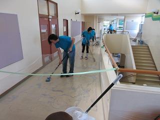 廊下もまずきれいにして、ワックスを 塗ってから抗菌します。 |