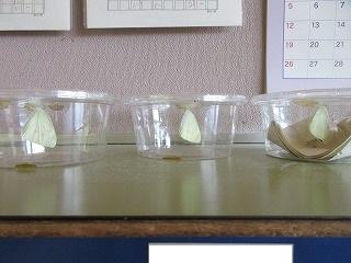 3年生が育てているモンシロチョウ。今日羽化したのは、8人目の児童です。8人目の児童は3匹育てています。その3匹のうちの2匹目が羽化しました。たまごから育てていたモンシロチョウです。