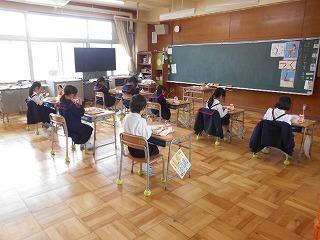 今日は5・6年生が家庭科、3,4年生が算数を「わたり」(2つの学年が同じ教室でちがう学習をする)で学習していました。